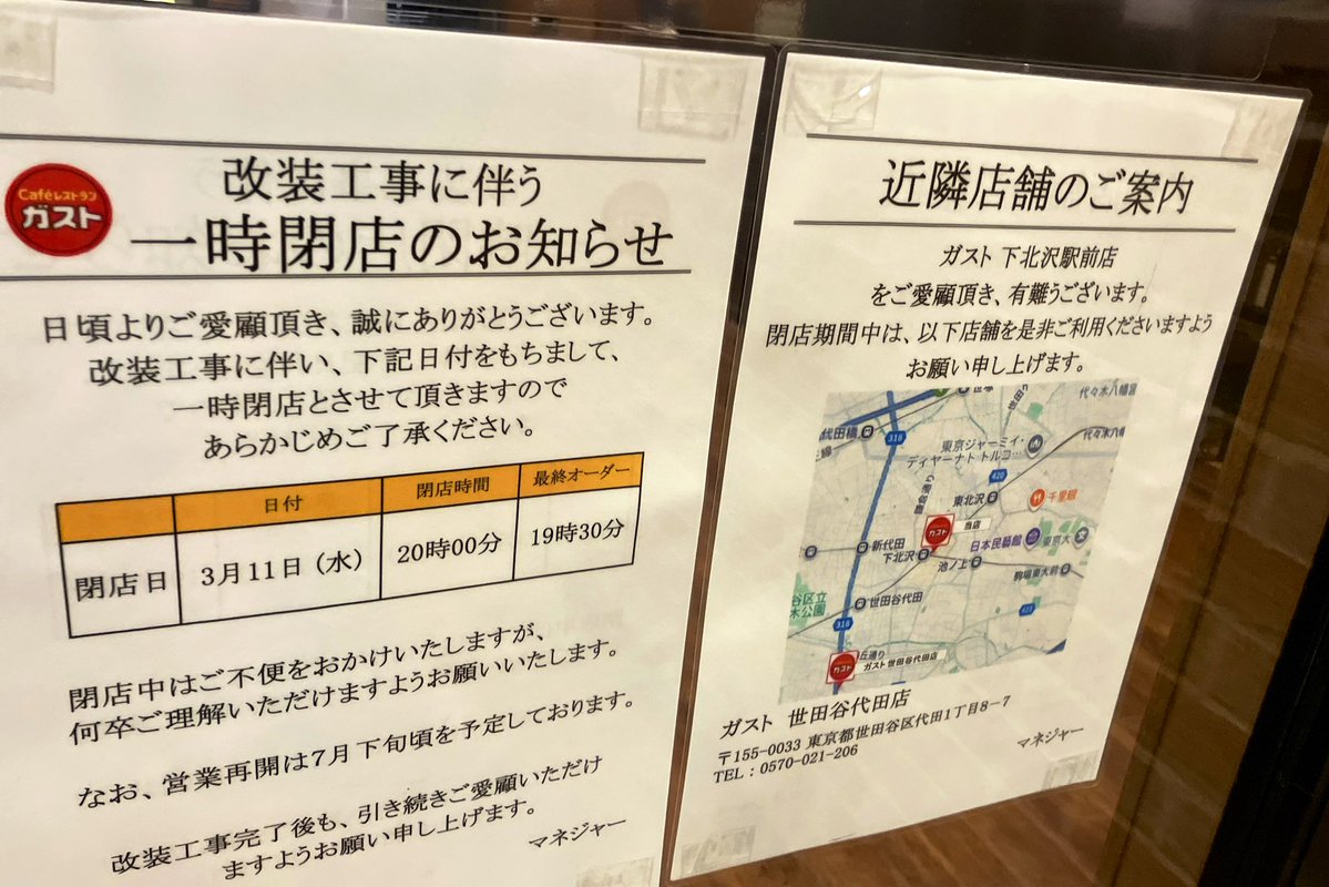 RT @shimobro: 下北沢のガスト、一時閉店でした。3/11 20:00閉店で、営業再開は7月下旬とのことですー、よかったー! https://t.co/svw66dO797
