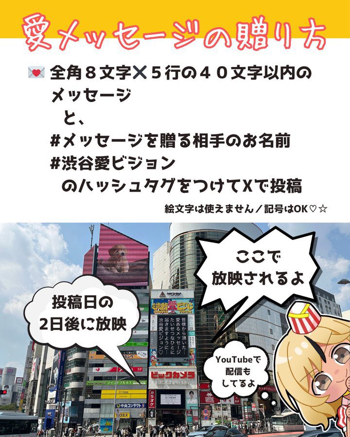 本日23:59までにXで投稿すると、2/3(火)12時から渋谷駅前の大型ビジョンでメッセージが放映されるよ❣️