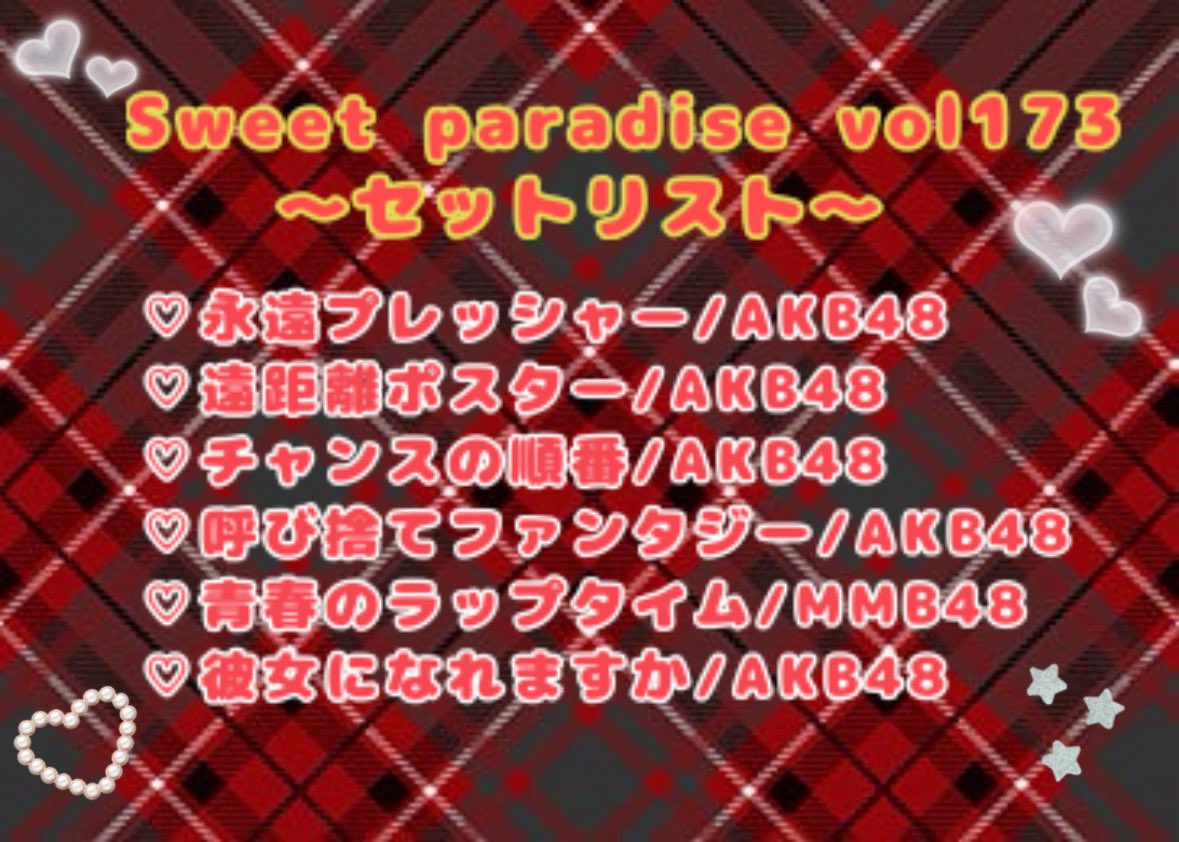 Sweet paradise vol.173のセットリストを公開いたします💎 今回は48縛りです💫一緒にいっぱい盛り上がりましょう🎶 ご予約まだまだお待ちしております❣️ https://t.co/Hhln5EevNb https://t.co/9ATv5VHwjn