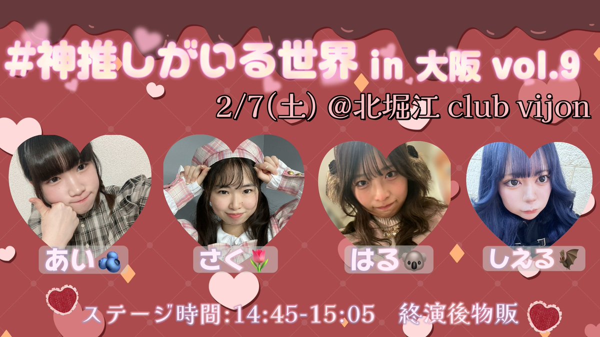 【💎お知らせ💫】 2月7日(土)に開催される、#神推しがいるセカイ in 大阪 vol.9 に出演させていただきます🍒 出演メンバーは画像をご覧下さい💌 ご予約は本日の20時開始です🙌 引用元からお願い致します🎶 #アイリス龍星群 #関西ユニドル #UNIDOL https://t.co/7wxA5DcjFY https://t.co/Esix1tE7x6