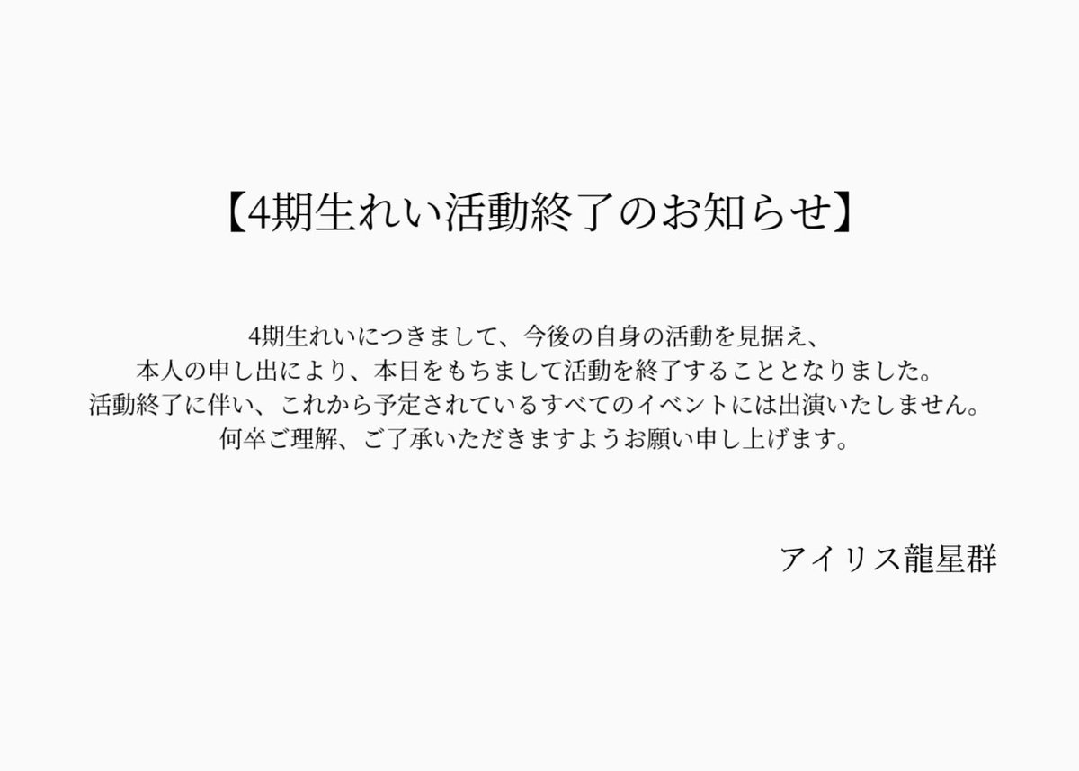 【お知らせ】 平素よりアイリス龍星群を応援していただきありがとうございます。大切なお知らせですのでご一読いただけますと幸いです。 今後ともアイリス龍星群をよろしくお願いいたします。 https://t.co/ENodKEtj26