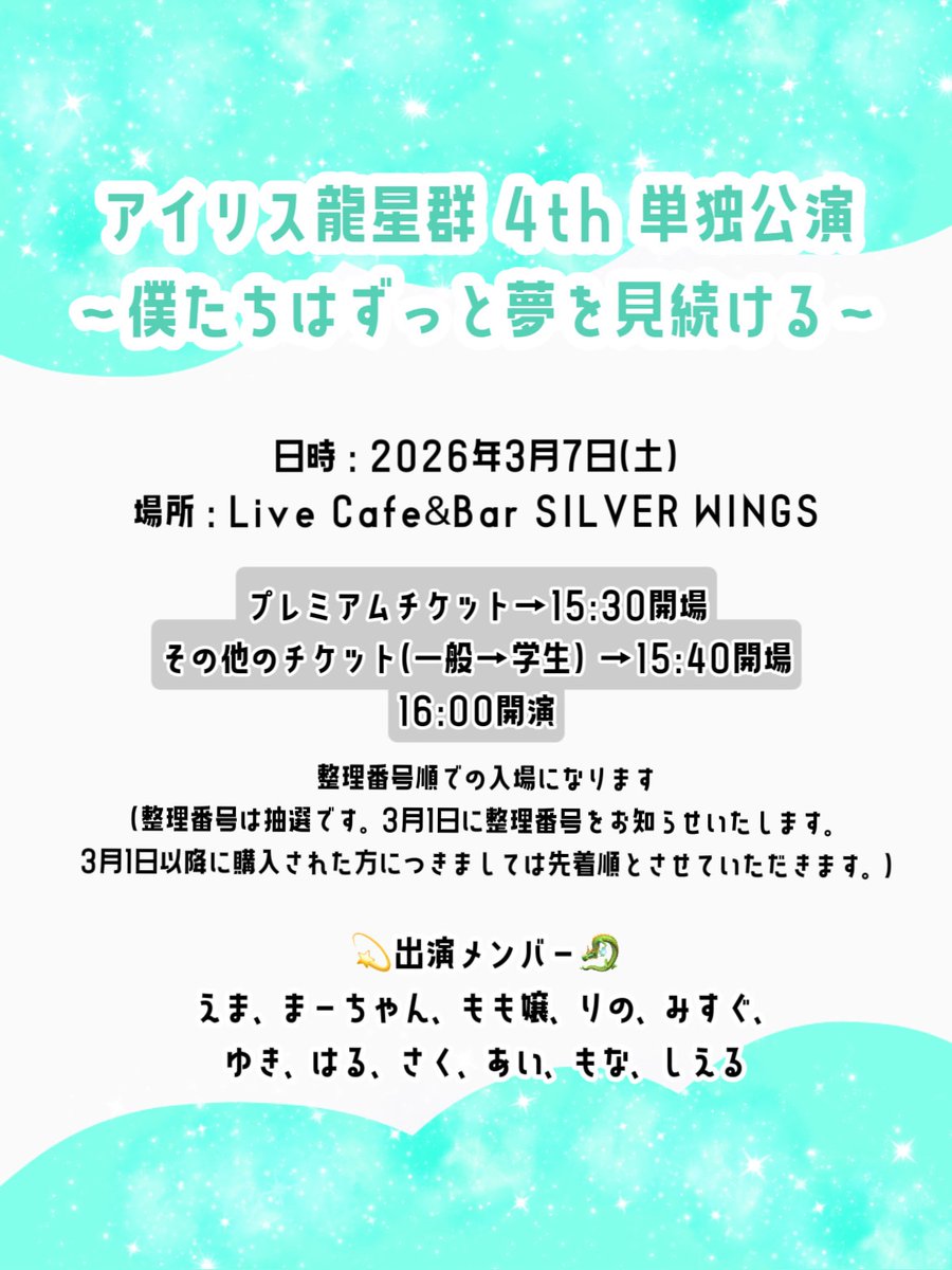 【💎お知らせ💫】 明けましておめでとうございます🎍 「アイリス龍星群4th単独公演~僕たちは夢を見続ける〜」の詳細が決定いたしました✨️ 詳細は画像の通りです! チケットは下のリンクから⬇️🔗 (※整理番号は抽選です) 是非ご購入よろしくお願いいたします🐉 https://t.co/Kh5LYyQ6oF https://t.co/aLwSQNnqEe