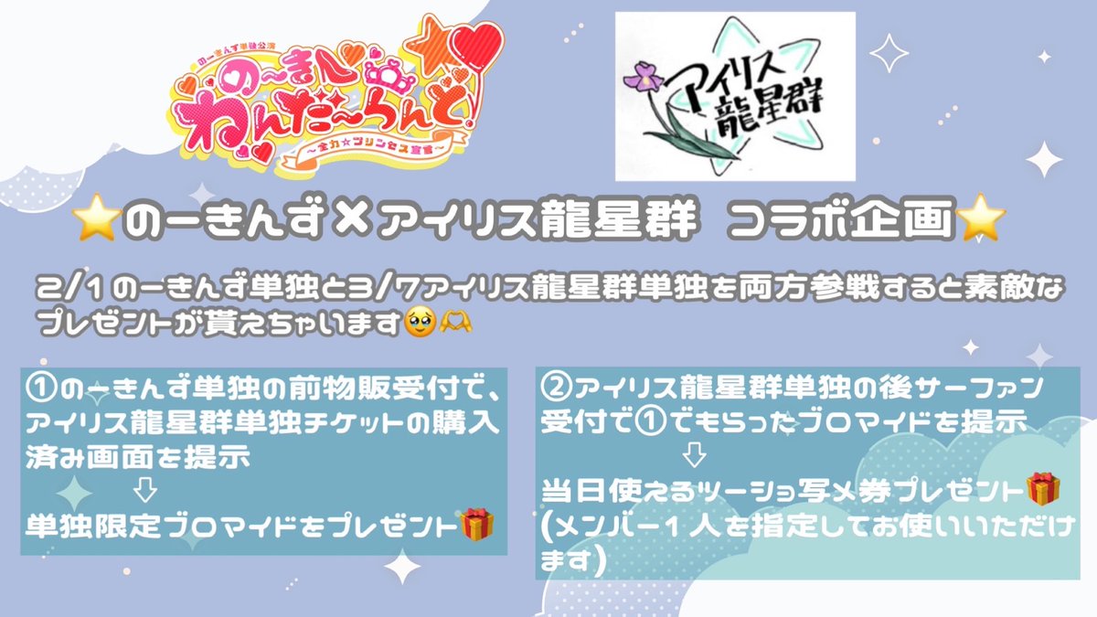 【💎お知らせ💫】 のーきんずとアイリス龍星群で単独公演コラボ企画を行います✨️ 詳細は画像の通りです❤️🔥席種問わず全てのチケットが対象です❗️ 2/1の一きんず単独のチケットはこちらから⬇️ https://t.co/uEf9j9ZtPs 3/7アイリス龍星群単独のチケットはこちらから⬇️ https://t.co/Kh5LYyPyz7 https://t.co/N2IzJiP1Qw
