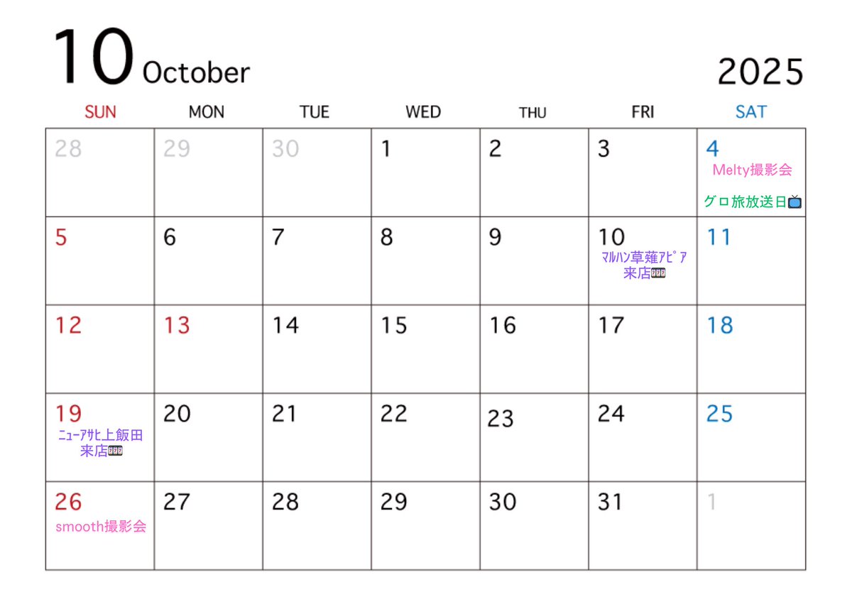 👻10月のスケジュール🍭 4(土)Melty撮影会📷 https://t.co/wkjXzeWSEh 22:00~BS10 マーク・パンサーの地球を感じる!グローブ旅📺 https://t.co/c6gnwc50DM 10(金)マルハン草薙アピア(静岡)🎰 19(日)ニューアサヒ上飯田(長野)🎰 26(日)smooth撮影会📷 https://t.co/Eom1sswb7f https://t.co/liiLAlU7LX