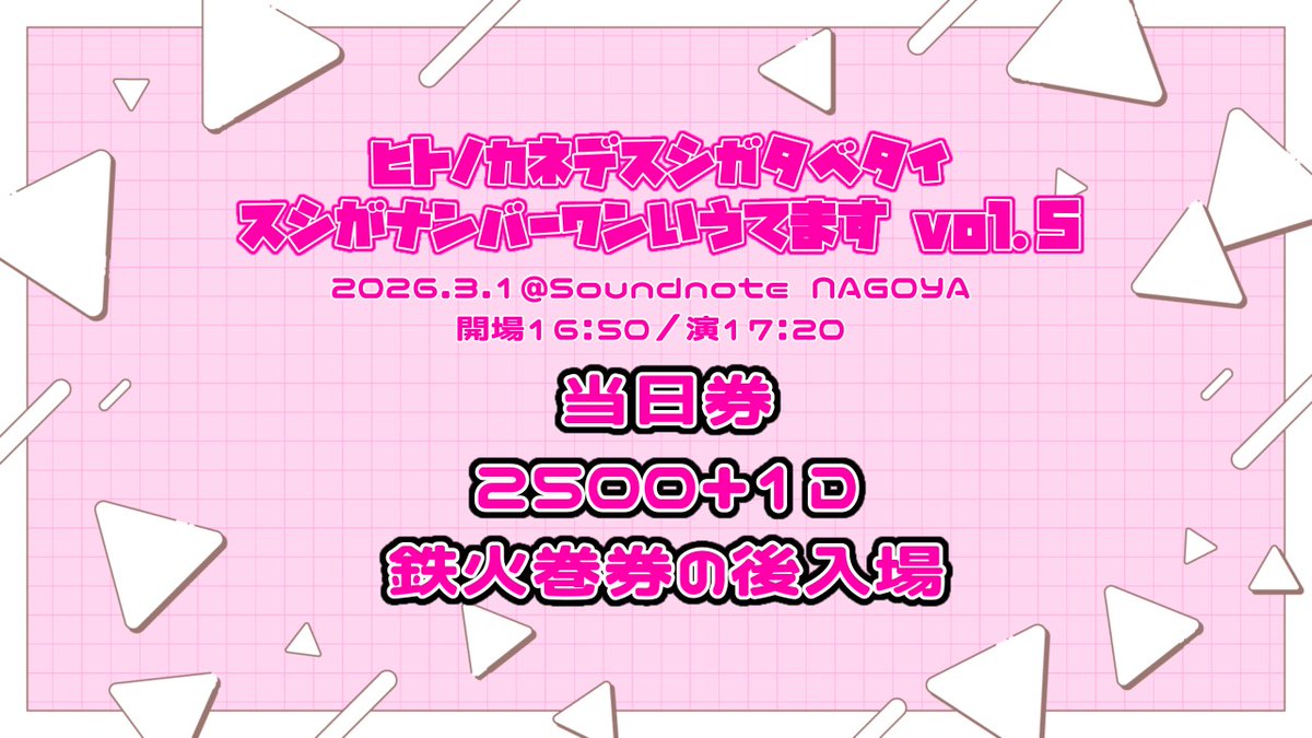 🍣当日のおすしらせ🍣 ついに単独公演当日となりました! Open 16:50 Start 17:20 📍Soundnote NAGOYA 当日券 ¥2,500 + 1D 大トロ券から整番順に入場となります。 開演までの間もグッズや特典券の購入が可能です📸 ⚠️来場する方々はチケットとは別にD代¥600が必要です。 ⬇️ツリーに詳細あり https://t.co/MUNmJ8rb0M