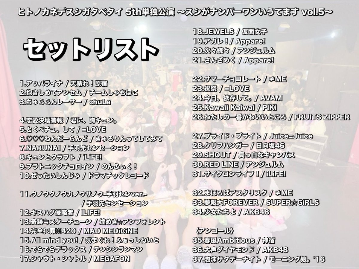 🍣セットリスト公開🍣 本日の単独公演のセットリストを公開します📸 単独公演の感想は #ヒトスシ5th単独 をつけてツイートしてくださると嬉しいです📝 https://t.co/OHAaDBxQ6o https://t.co/RjO70LEEX7