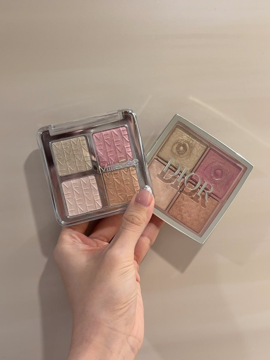 噂のミルフィーハイライトが届いたので本家と比較📝 色味は手元スウォッチのみだとほぼ一緒。 ・ツヤ感:輝きは同じくらい。ミルフィーは単色発光系ラメ、Diorは多色ラメで多幸感出る。 ・発色:ミルフィーは1塗りで高発色。ディオールは発色弱めで色のフィルターが薄くかかる感じ 続く🔽 https://t.co/MuumSatUK4