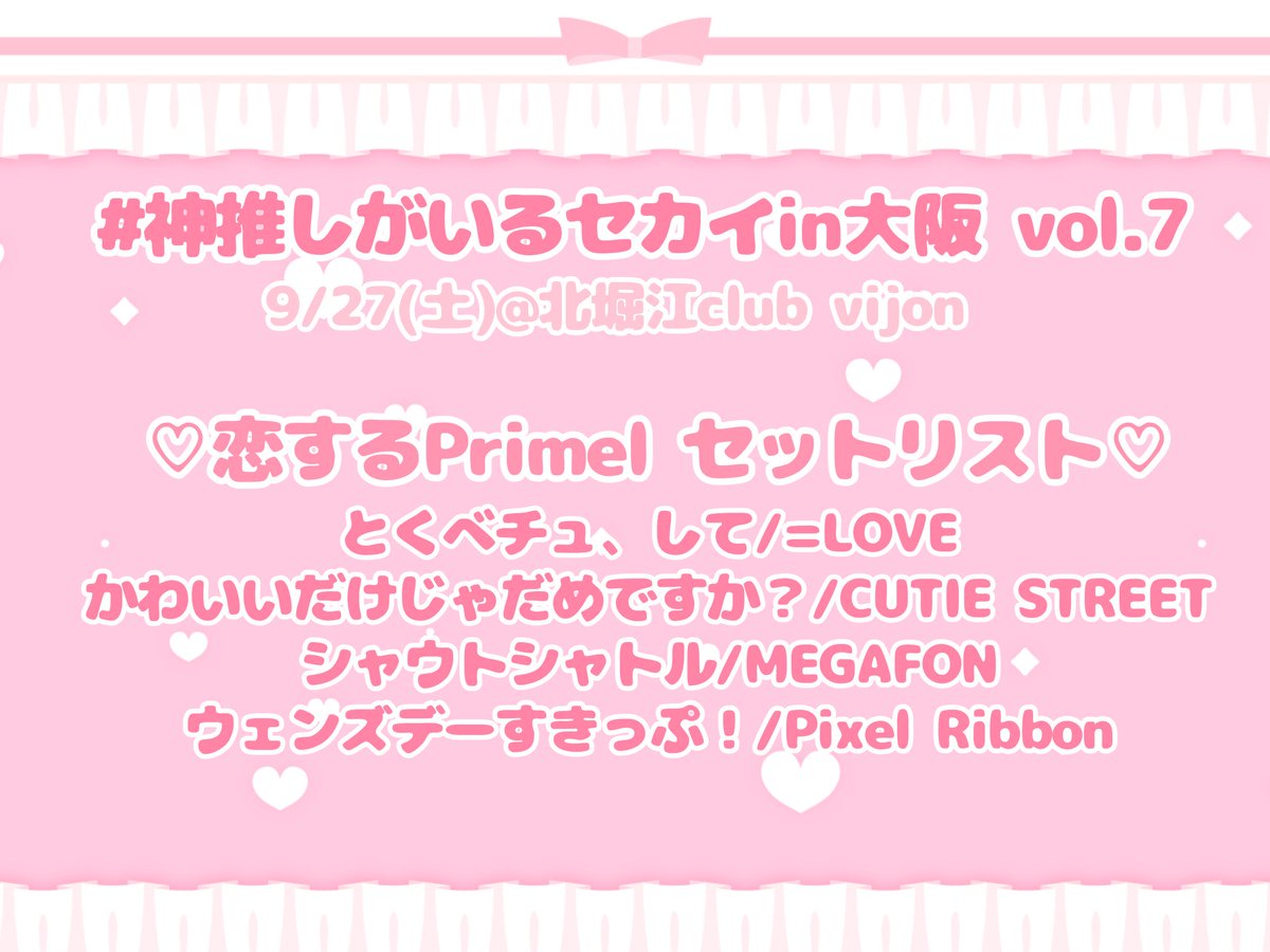 RT @Ys_journal: K大学 恋するPrimel #神推しがいるセカイ in 大阪 Vol.7 ▶️https://t.co/WRrwUGffLc 2025.9.27(土) 北堀江 club vijon Set list 1. とくべチュ、して / =LOVE…