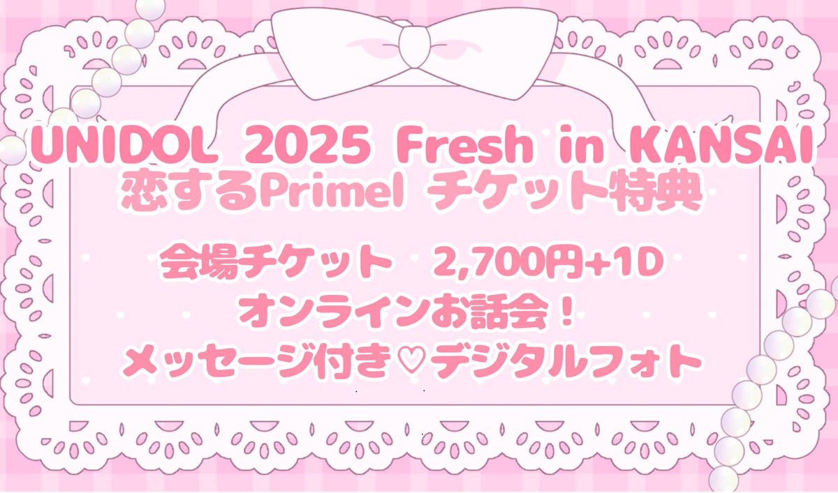 🩷🫧UNIDOL 2025 Fresh in KANSAI 🫧🩷 【チケット販売開始のお知らせ】 只今より チケットの販売を開始いたします🎶 チケット特典は以下の画像の通りです⭐️ ご予約はこちらから→ https://t.co/BWdOYHxnpG #恋するPrimel #こいぷり #UNIDOL #UNIDOL関西 #ユニドル25F https://t.co/ZvEFm0b3Tr