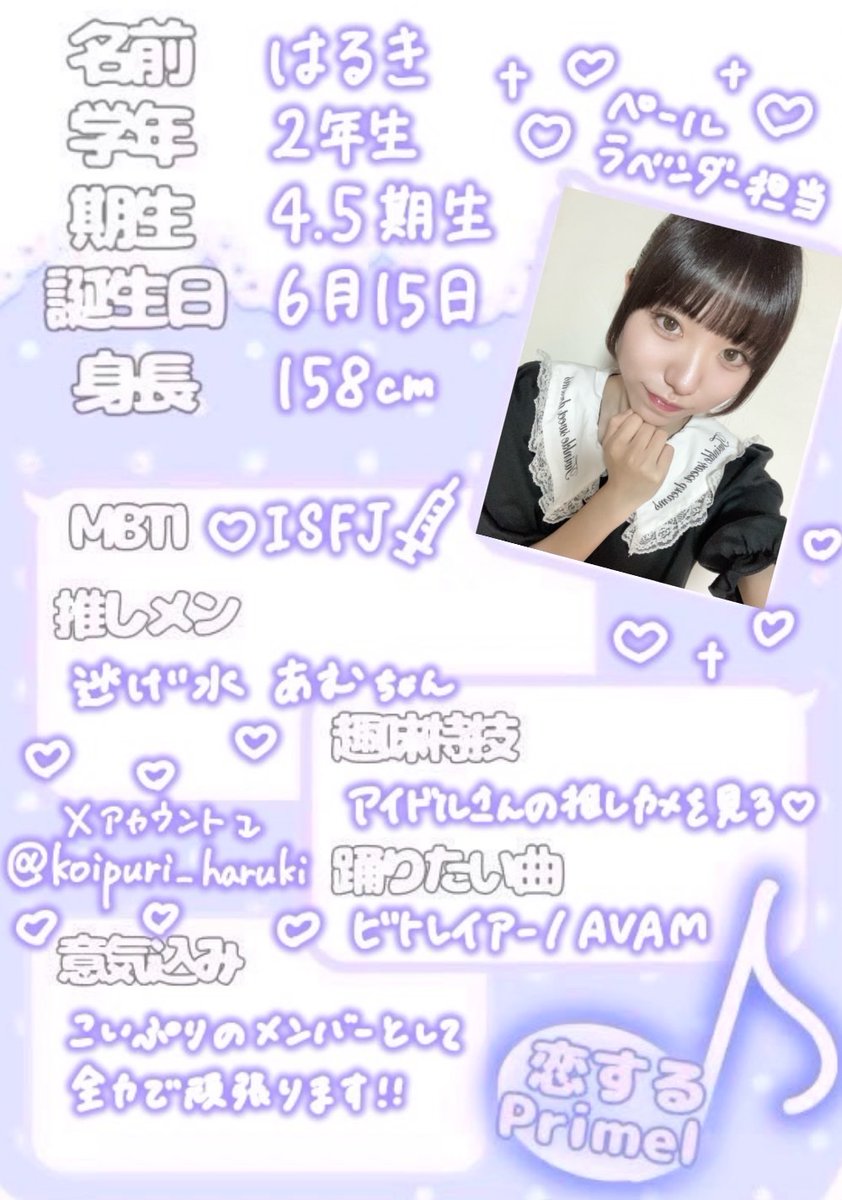 RT @koipuri__haruki: 初めまして🫧 恋するPrimel 4.5期生になりました ペールラベンダー担当 はるき🦢です♡ こいぷりのメンバーとして全力を尽くして頑張るので、応援してくれると嬉しいです🤍 https://t.co/JwYiH9xcIN