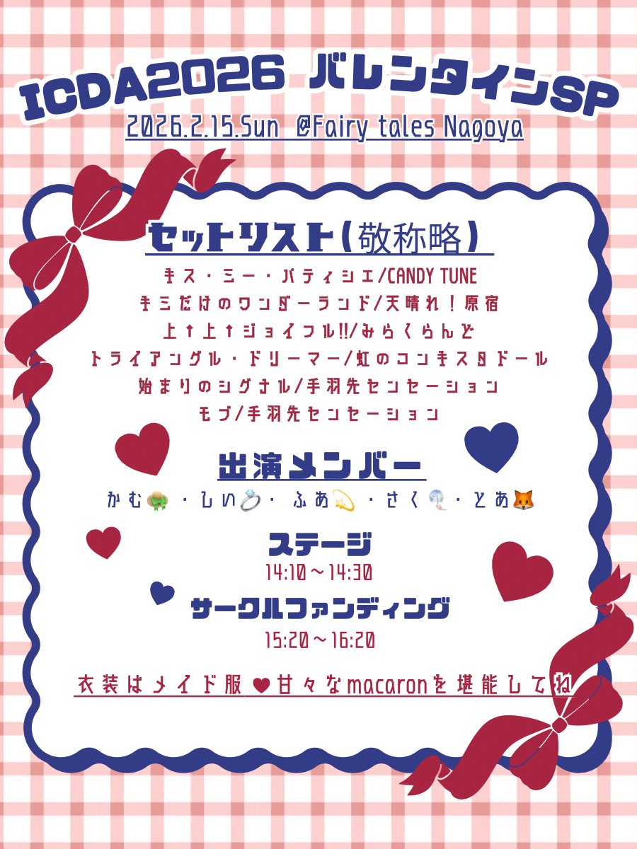 ☁️#macaronイベント情報☁️ 2/15(日)【ICDA2026バレンタインSP】さんに出演させていただきます🌈 出演メンバーは 【かむ👒・しい💍・ふあ💫・さく🎐・とあ🦊】 です! 今回の衣装はメイド服です!レアでかわいいmacaronのステージをお楽しみに🫶 ぜひお越しください! #UNIDOL東海 https://t.co/EMFp9Bb4u6 https://t.co/gRkP1yjoNp