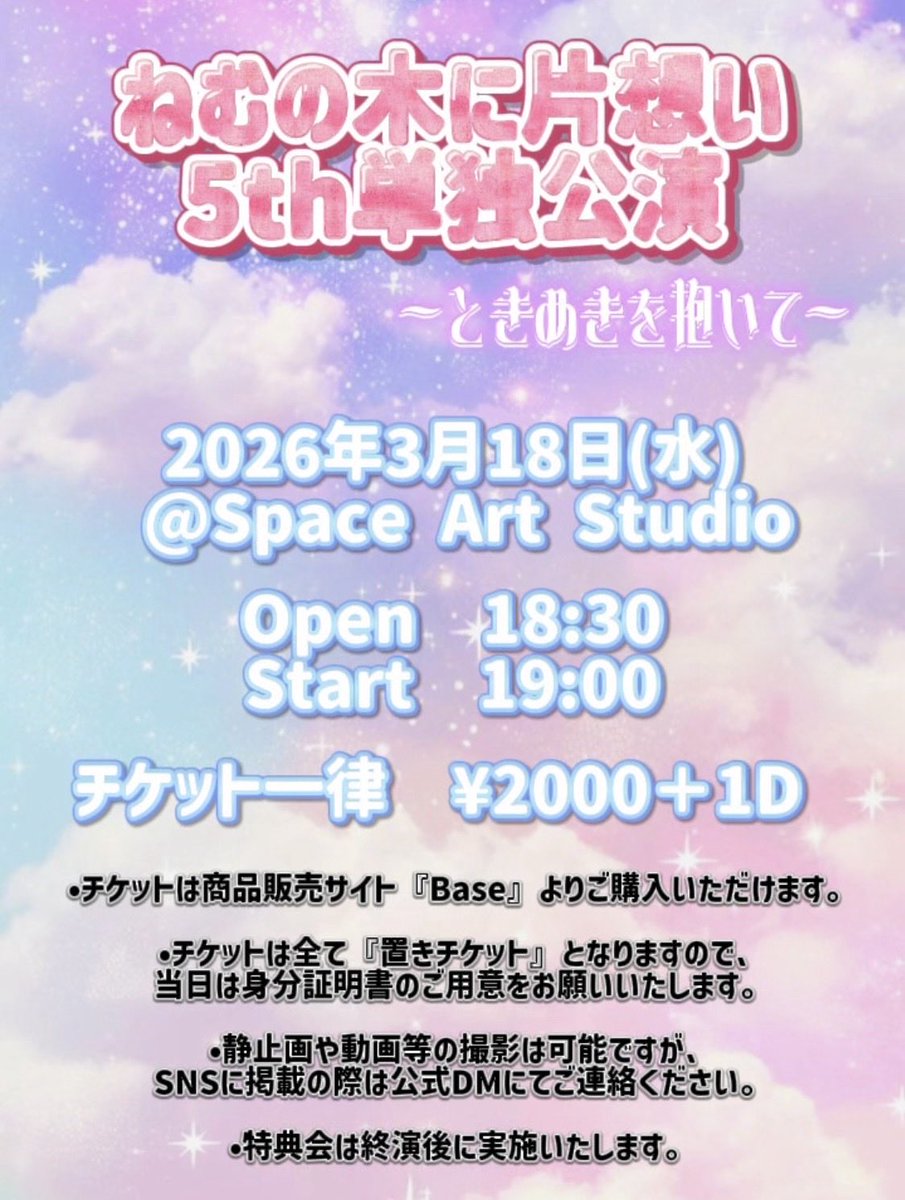 ☆.*゚•*¨*•.¸♡o。+ ☆.*゚•*¨*•.¸♡o。 チケット発売のお知らせ🎟💭 ☆.*゚•*¨*•.¸♡o。+ ☆.*゚•*¨*•.¸♡o。 3/18(水) Space Art Studioで行われる、 5th単独公演のチケットの発売を開始します🌟 一律 ¥2,000 (+1D) たくさんのご来場をお待ちしております! https://t.co/1hsgpgFfJH