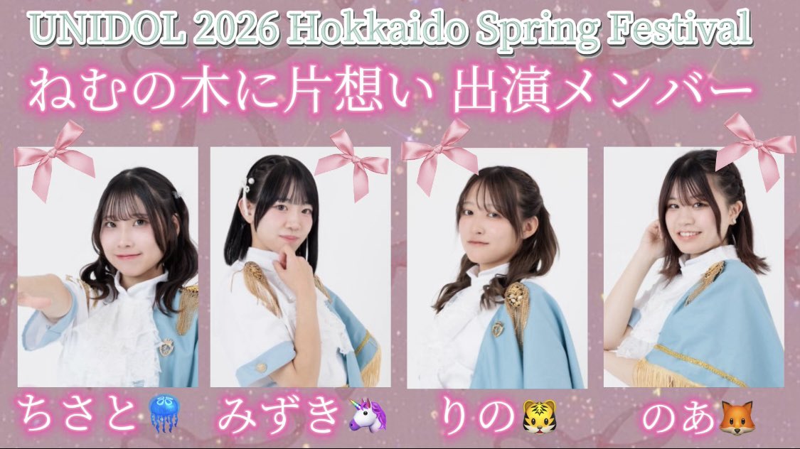 【🌳出演情報💕】 UNIDOL 2026 HOKKAIDO Spring Festival に出演させていただきます! 出演メンバーは ちさと🪼 みずき🦄 りの🐯 のあ🦊 の4名です⋆⸜♡⸝⋆ https://t.co/IGg3wwvASZ https://t.co/xNdJBqTiAC