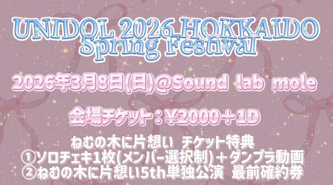 【✨チケット販売開始✨】 UNIDOL 2026 HOKKAIDO Spring Festival チケットの販売を開始いたします🌳💕 日時:2026年3月8日 夜帯 場所:Sound lab mole ご購入はこちらのリンクから🔗⬇️ https://t.co/QJ2oMInzCX https://t.co/d7f7vw8gtn https://t.co/sQWoujwto5