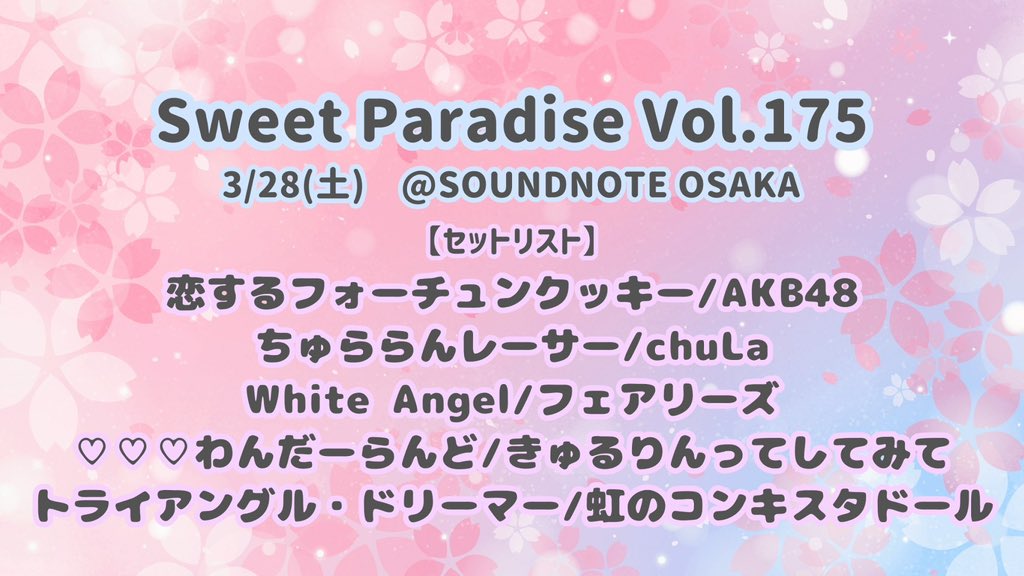 🍑#ピチカイベント情報🍑 2026年3月28日(土) Sweet Paradise vol. 175の セットリストを公開致します✨ 予約は当アカウント DMにて受付中です! たくさんのご予約、ご観覧お待ちしております😌♡ #春から同女 #春から同志社 #Pichicart #関西ユニドル #UNIDOL https://t.co/O0shQQO2Ek