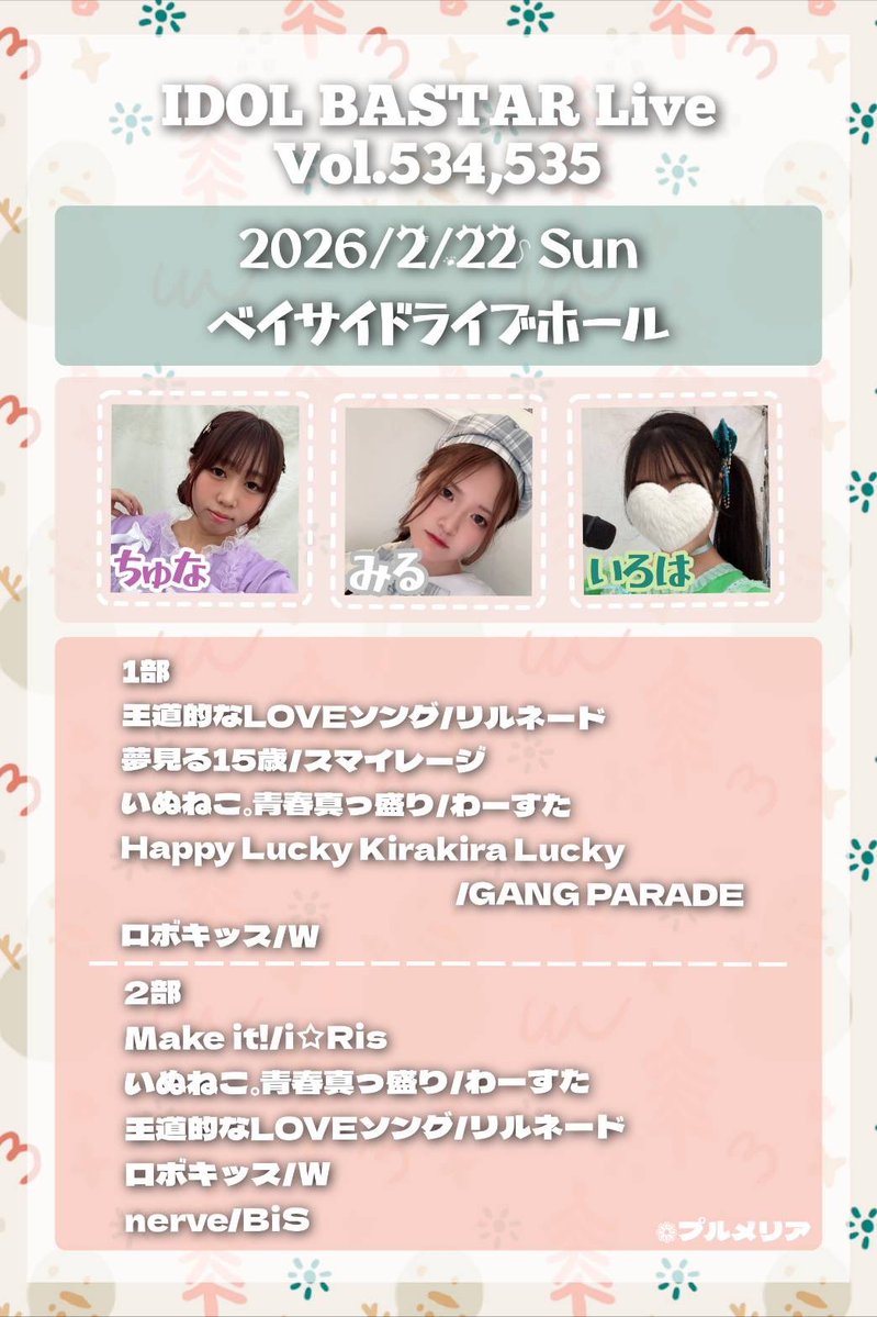 🌼イベント情報🌼 2/22(日) IDOL BASTAR LIVE 📍ベイサイドライブホール 1部 🎤13:25-13:40 📸14:25-15:25 2部 🎤16:45-17:00 📸17:45-18:45 ご予約はDMまで‼️ https://t.co/9hooHYPpni