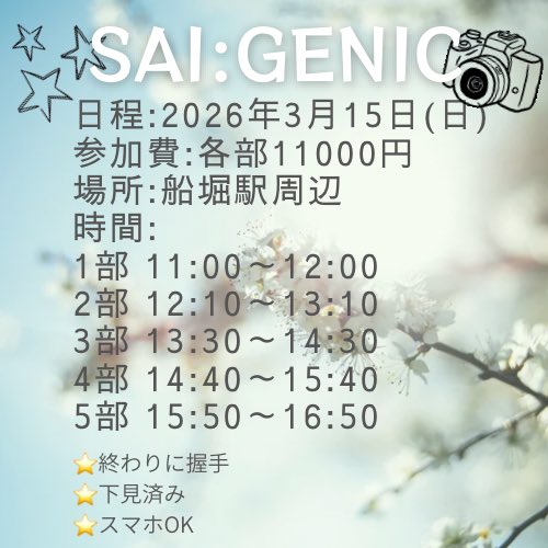 ⭐️告知 3/15(日)は晴星月一の事務所主催屋外個撮 #SAIGENIC です! 2人だけ、デートのような楽しい1時間はいかがですか? 時間 11:00-12:00 12:10-13:10 13:30-14:30 14:40-15:40 15:50-16:50 場所は船堀駅周辺です 予約 3/2 21:00~👇 https://t.co/lWXr9kMElU #ポートレート 詳細はスレッドへ⤵︎ https://t.co/IgyHuypSNb