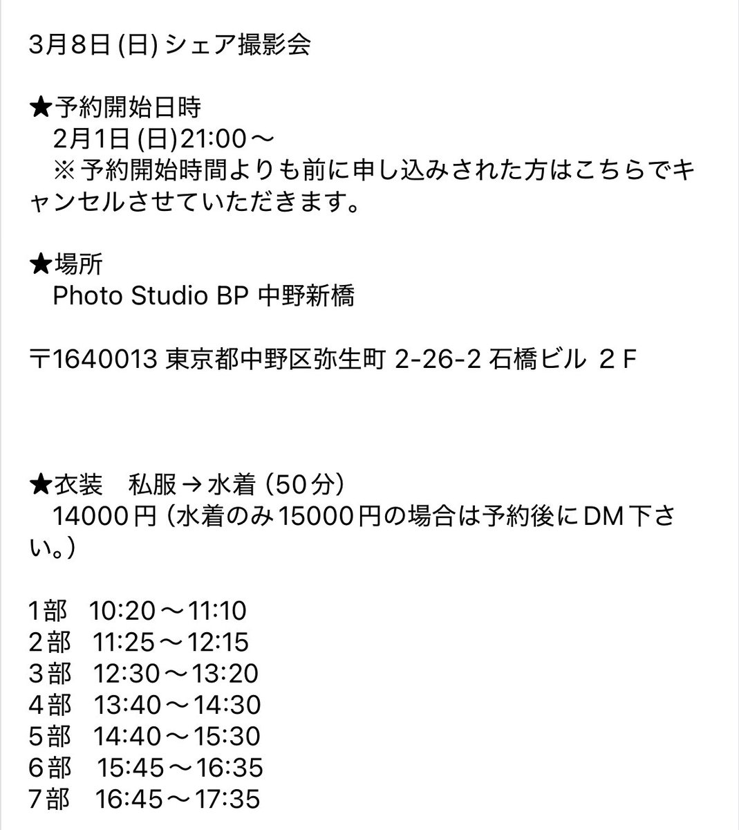 3月8日(日)撮影会の予約は 2月1日(日)21:00〜開始になります! 今必死に予約サイト作ってます🤣 スタジオは中野新橋です!